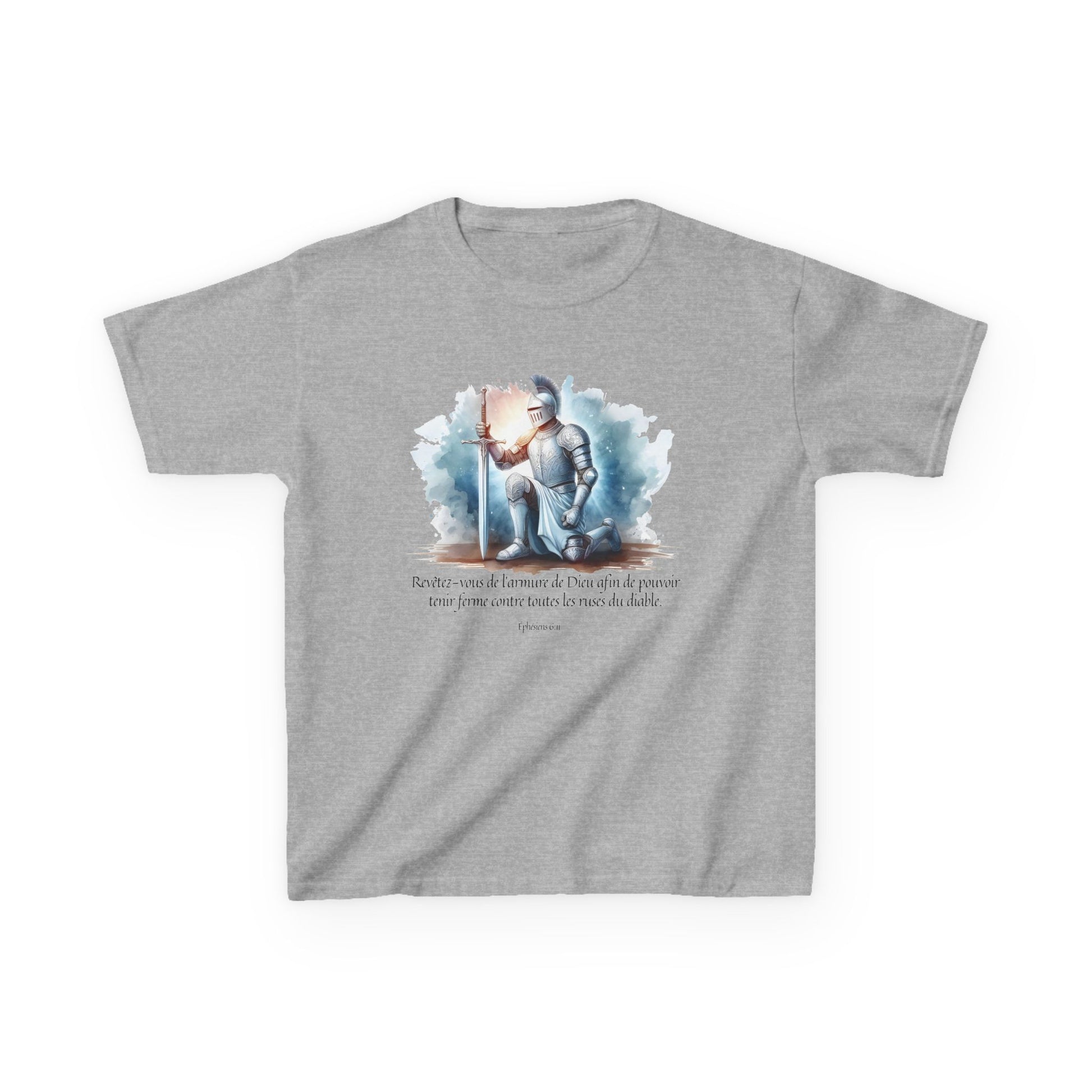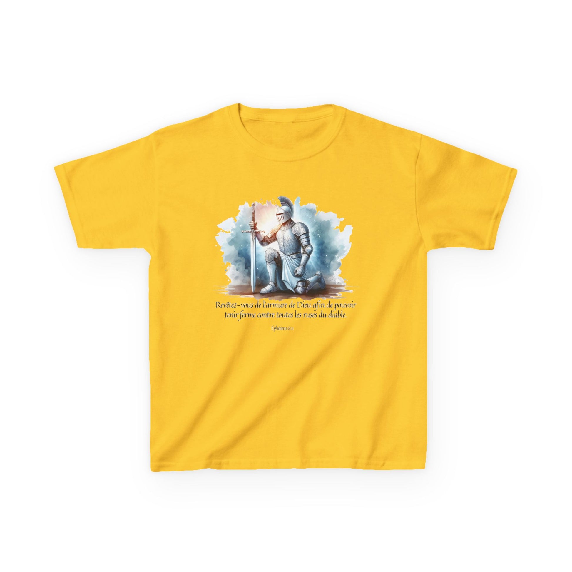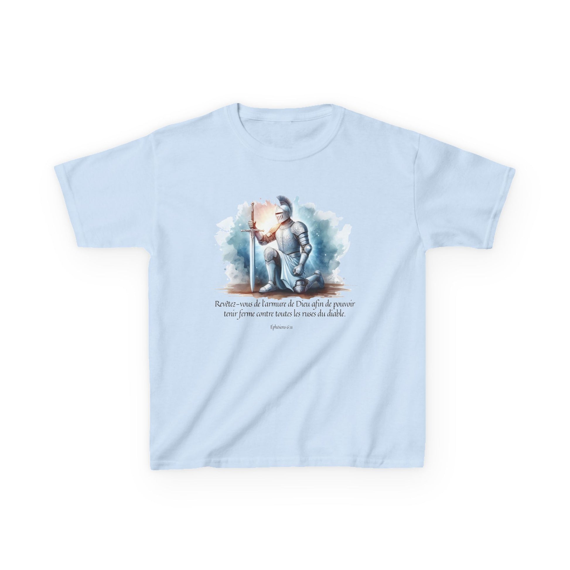 .: Avant : Un guerrier agenouillé et tenant une épée. Il est écrit "Revêtez-vous de l'armure de Dieu afin de pouvoir tenir ferme contre toutes les ruses du diable. [Éphésien 6:11]"